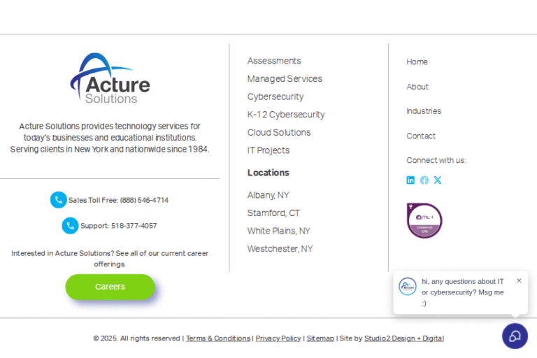 At Acture Solutions, we believe that our people are our greatest asset. Nestled in Albany, we offer a dynamic environment where IT services come alive through collaboration and innovation. Our mission is to empower businesses with cutting-edge managed IT services, cybersecurity, and cloud solutions, all while fostering a culture that prioritizes personal growth and team spirit.