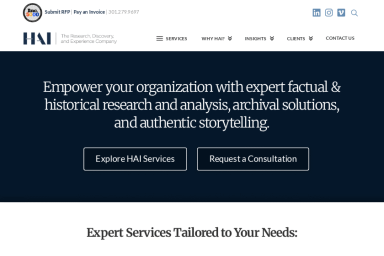 At History Associates Incorporated, we believe that every project tells a story, and our team is dedicated to uncovering those narratives for a diverse range of clients. We specialize in research, discovery, and experience services, working closely with government agencies, corporations, legal entities, educational institutions, museums, and associations. Our mission is to provide insightful solutions that bring history to life, and we do this through a collaborative and innovative approach.