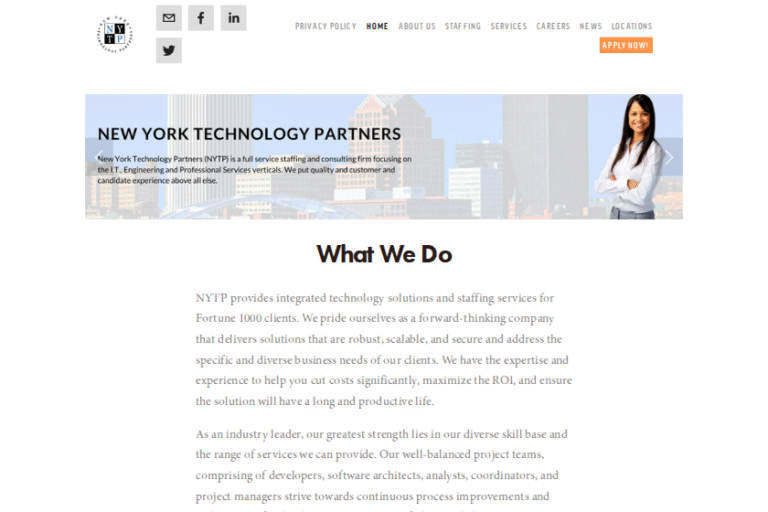At New York Technology Partners, we pride ourselves on being more than just a technology services provider. We are a vibrant community of innovators, problem-solvers, and collaborators dedicated to delivering top-notch consulting and staffing solutions. Our team works closely with Fortune 1000 companies, helping them navigate the complexities of databases, web technologies, and CRM systems. This collaborative spirit is at the heart of our culture, making every day an opportunity to learn and grow together.