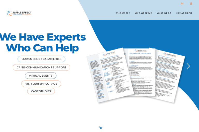 At Ripple Effect Communications, we believe in the power of collaboration and creativity. Our team of over 180 experts works diligently to provide top-notch consulting services to federal, private, and nonprofit clients. Every day, we strive to make a meaningful impact, and we’re proud to support initiatives that help communities thrive.
